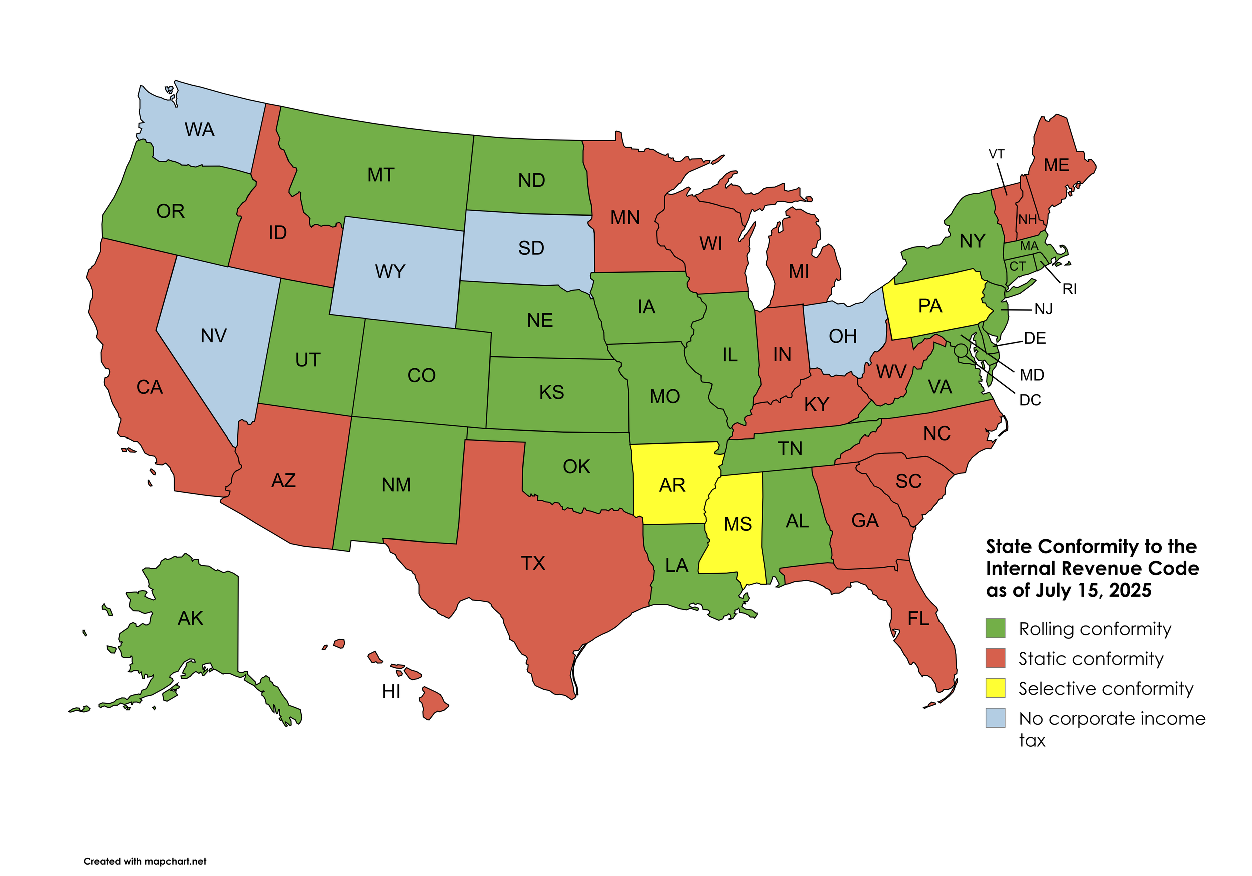 The below map shows how each state conforms to the IRC as of July 15, 2025. Note that California is both a static and a selective conformity state because it selectively conforms to the IRC of 2015.